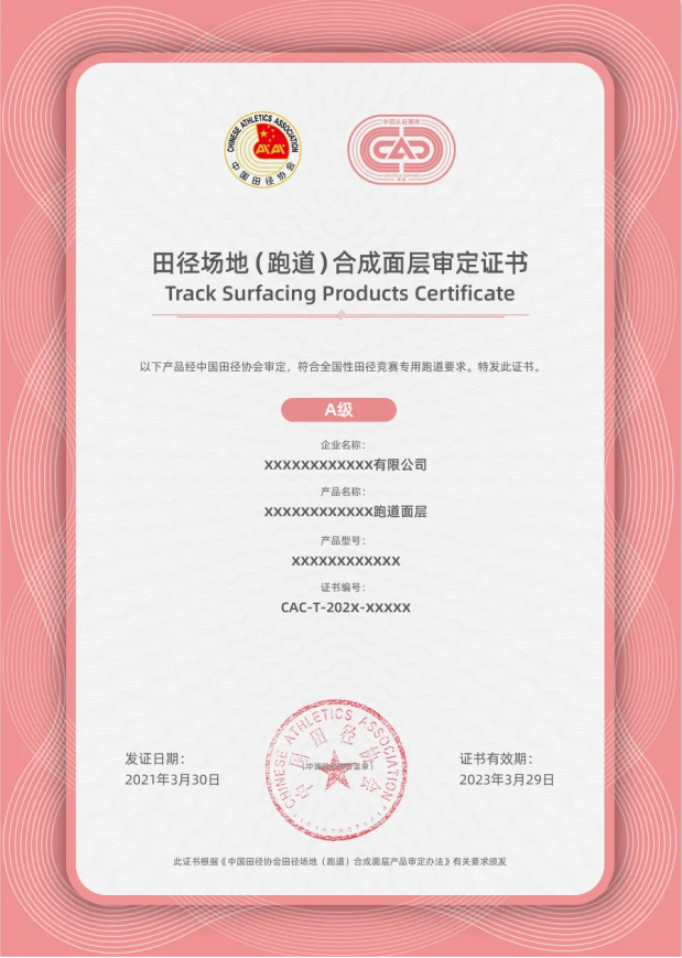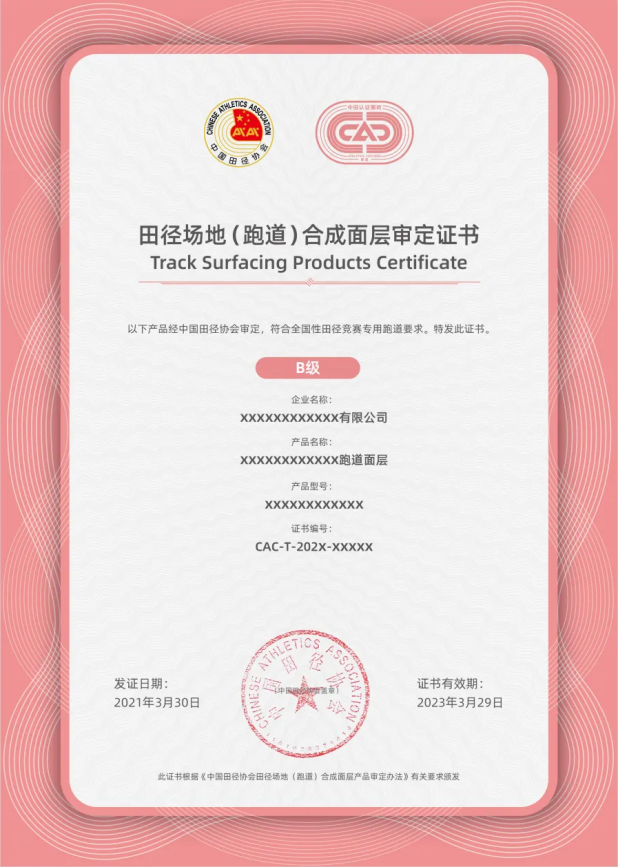中國(g↕uó)田協将合成面層審定産品分(fēn)>± 為(wèi)A級和(hé)B級。工(gōng)廠(chǎng)實地(dì)檢查通(t★♦∏×ōng)過後,中國(guó)田徑協會(huì)将頒發B級合成面層産品審定證書(shū)。B級合成面層産品如(rú)滿足以下(xià)審定條件(jiàn)σσ,可(kě)申請(qǐng)中國(guó)田協A級合成面層産品審定證書(shū)。