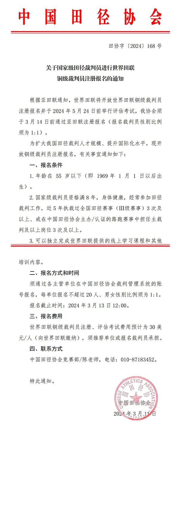 關于國(guó)家(jiā)級田徑裁判員(yuán)進行(xíng)©™¶世界田聯銅級裁判員(yuán)注冊報(bào)名的(de)通(tōng↔'↕)知(zhī)