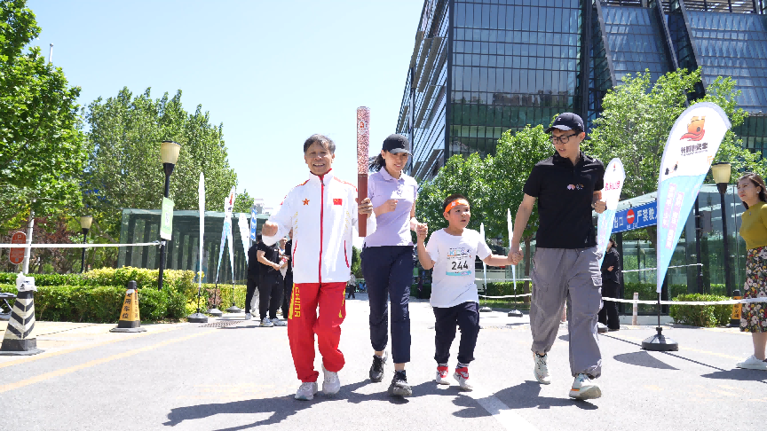 2008年(nián)北(běi)京奧運會(h<←✘uì)火(huǒ)炬手劉超英與“小(xiǎo)小(xiǎo)關門( ↓→mén)兔”一(yī)起向終點沖刺