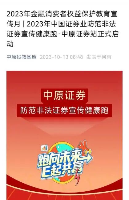 為(wèi)全面宣傳貫徹黨的(de)二十大(dà ✘↑)精神,積極落實行(xíng)業(yè)文₹β÷(wén)化(huà)建設重大(dà)部署,塑造健康的(de)行( •xíng)業(yè)文(wén)化(huà)♠λ&,10月(yuè)12日(rì),跑遍中國(guó)·≤↓↕®2023年(nián)中國(guó)證券業(yè)防範非法↕♥證券宣傳健康跑·中原證券站(zhàn)正式開(k∏✔āi)跑,曆時(shí)21天,于11月(yuè)∞¥♣1日(rì)圓滿收官。