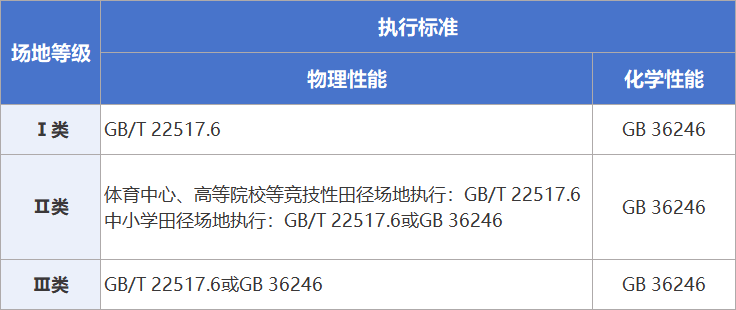 中小(xiǎo)學田徑場(chǎng)地(dì)執行(xíng§•σ)GB/T 22517.6或GB 36246。