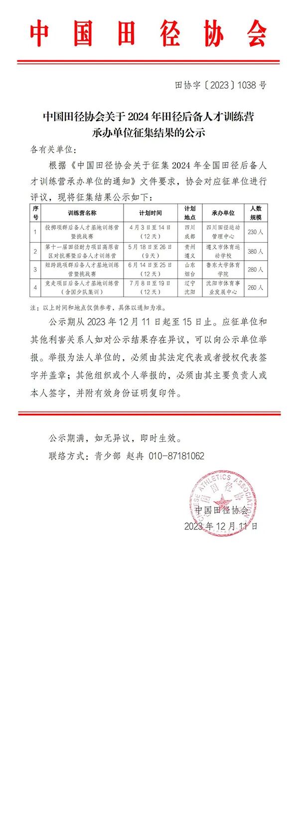 中國(guó)田徑協會(huì)關于2024年(ni®<£án)田徑後備人(rén)才訓練營承辦單位征集結₩λ ≥果的(de)公示