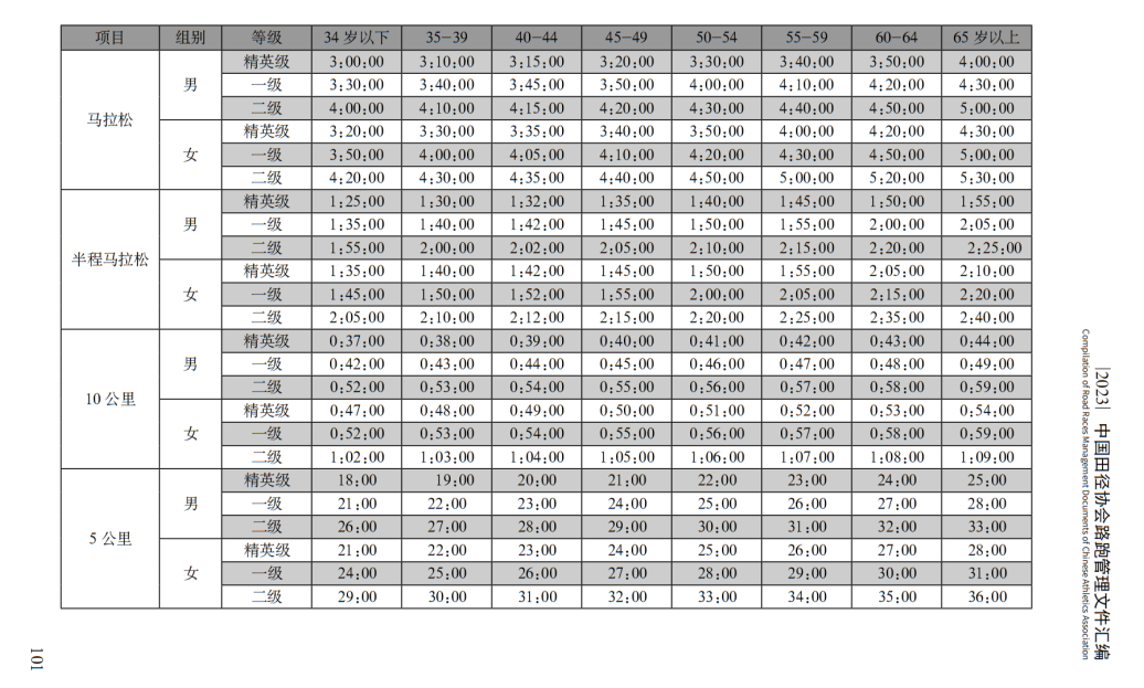 2023年(nián)3月(yuè),中國(guó)田徑協會$§ (huì)對(duì)《2022中國(guó)田徑協'₩∞會(huì)路(lù)跑管理(lǐ)文(wén)件(jià£n)彙編》進行(xíng)了(le)修訂,其中更<€新了(le)大(dà)衆選手等級評定的(de)實施方法,重新對(duì" )不(bù)同年(nián)齡段選手成績水(shuǐ)平進®♦→行(xíng)了(le)梳理(lǐ),制(zhì)定了(le)新的(d♦♠e)大(dà)衆選手等級評定标準。