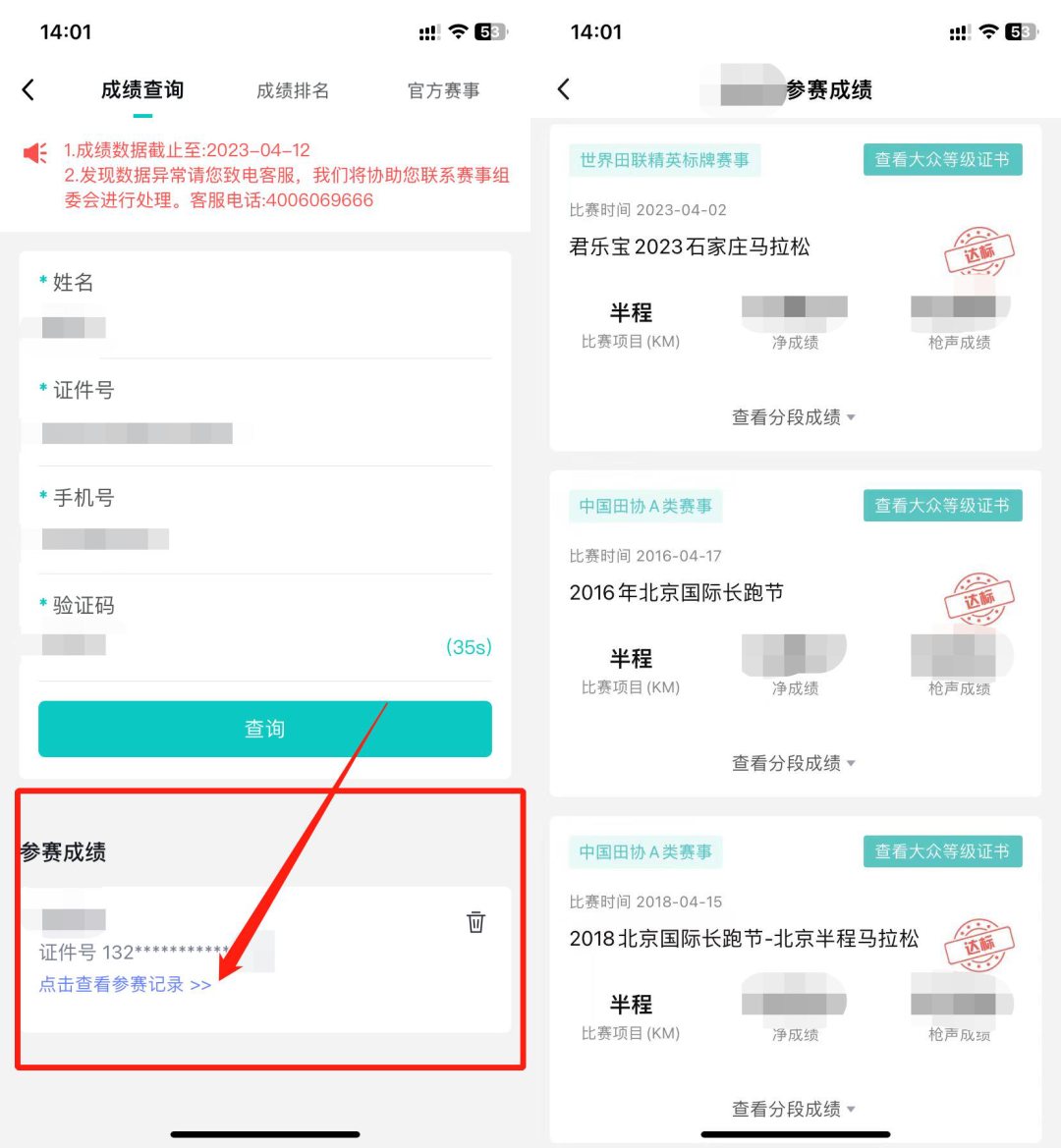 點擊“查詢”後,頁面底部将出現(xiàn)™∑π個(gè)人(rén)姓名及證件(jiàn)号信息,點擊“查詢參賽記錄”即可©¥★(kě)查看(kàn)到(dào)過往參與的(de)所有(y♥≠$>ǒu)馬拉松比賽成績。