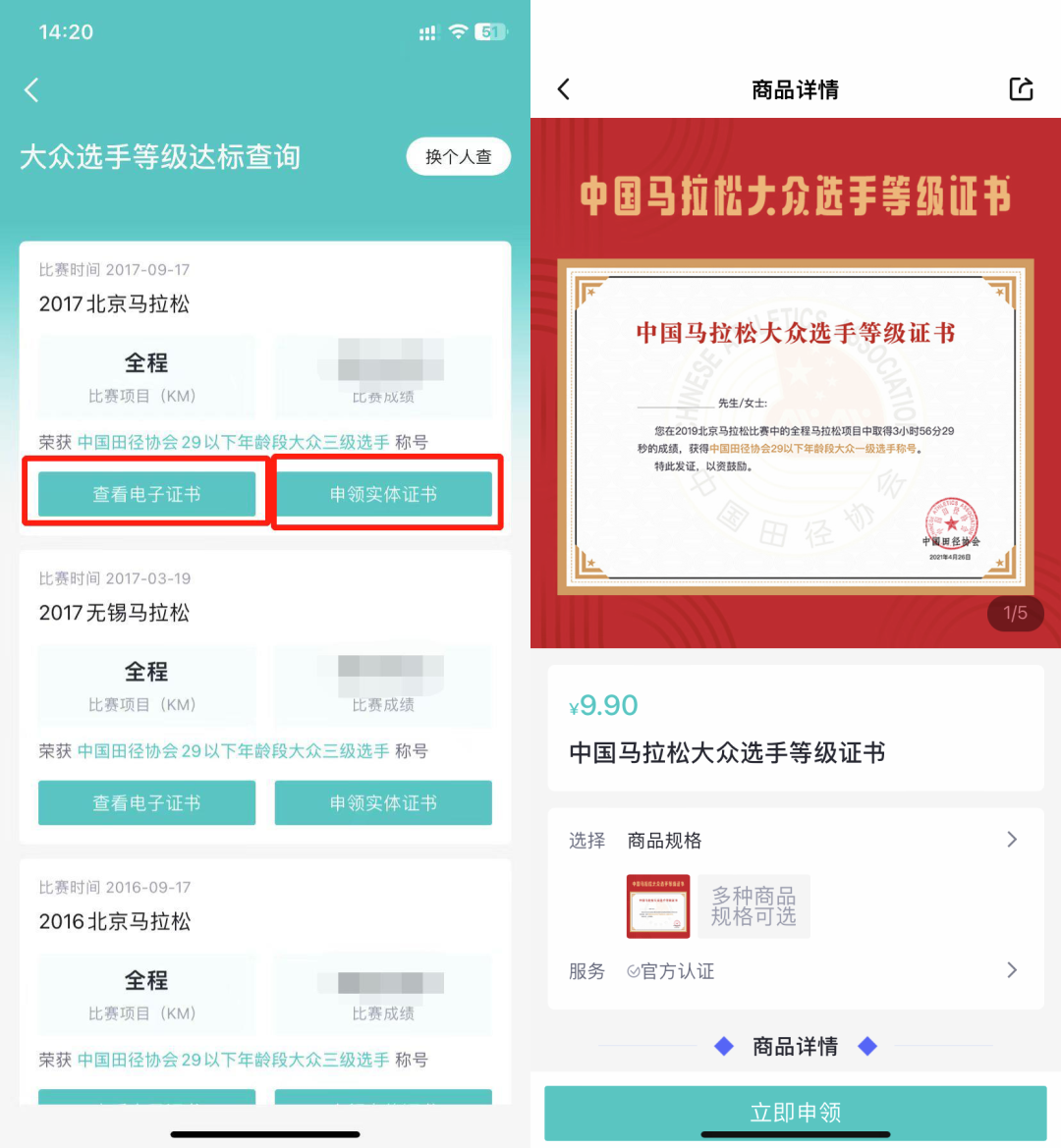 每場(chǎng)可(kě)申領大(dà)衆選手等級證書(shū)的★ε(de)賽事(shì)下(xià)方都(dōu)有(yǒu)兩個(•≤≤♥gè)按鈕,點擊左側“查看(kàn)電(diàn)子(zǐ)證書(shūγλ≥)”可(kě)直接查看(kàn)或分(fēn)享☆Ω♥÷電(diàn)子(zǐ)證書(shū),點擊右←₩₹←側“申領實體(tǐ)證書(shū)”即可 •≠(kě)進入實體(tǐ)證書(shū)申領頁,支付9.9元工(∏>σgōng)本費(fèi)即可(kě)收到(dào)一(yī)份實體(t $•ǐ)證書(shū)。