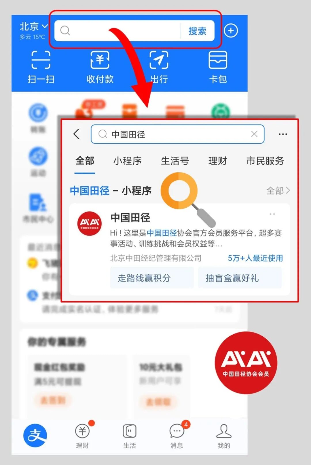 中國(guó)田徑協會(huì)大(dà)衆會(huì↓∏)員(yuán)現(xiàn)已上(shàng)線公測,并在支付寶小(xiǎo)程序開(kāi)通(t&♠∞ōng)了(le)免費(fèi)注冊服務,用(yòng)戶可(kě)下(xià)載π<©登錄支付寶APP,在搜索欄中輸入“中國(guó)田徑”,找到(dào ∞↓&)紅(hóng)色圖标的(de)中國(guó)田徑小(x♣©iǎo)程序,點擊進入。