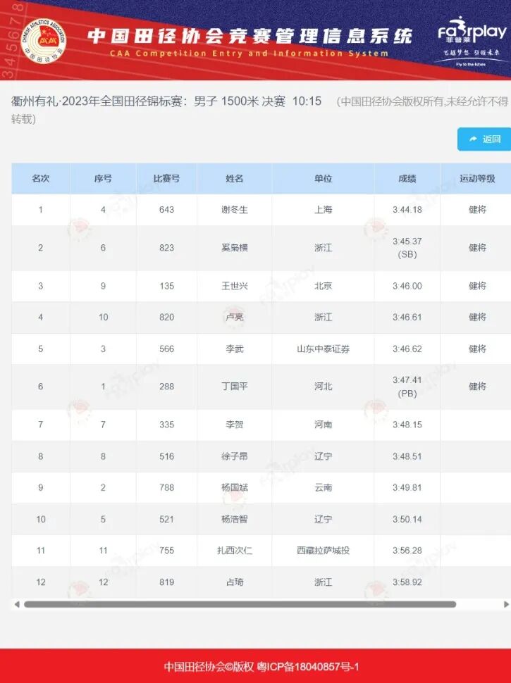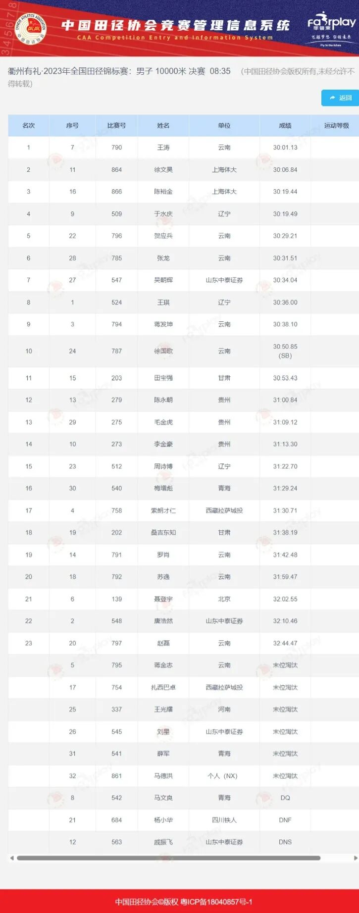 男(nán)子(zǐ)10000米項目中,雲南(§nán)隊的(de)王濤以30:01.13的(de)成績獲得(de)第一(y•↕&ī)名。獲得(de)第二名的(de)是(shì)來(γ>↕lái)自(zì)上(shàng)海(hǎi)體(tǐ)大(d±∏à)的(de)徐文(wén)昊,成績30:06.84,徐文(wén)昊在'¥∞今年(nián)上(shàng)海(hǎi)半程馬∑∞₩β拉松中以1:04:14獲得(de)國(guó)內(nèi)男(nán)×®≤子(zǐ)第二名,6月(yuè)27日(r®™↔ì)進行(xíng)的(de)全國(guó)田♠→徑冠軍賽男(nán)子(zǐ)5000米中,徐文(wé'♣"n)昊以13分(fēn)54秒(miǎo)55奪冠。6月(yuè)29日(rì)的(de)2023年(niá÷¶n)全國(guó)田徑冠軍賽暨世錦賽及亞運會(huì)選拔賽男(nán)子(zΩ¶♥↑ǐ)10000米中,徐文(wén)昊跑出了(le)★γPB成績29:33.30獲得(de)季軍≤∏→。曾奪得(de)2021年(nián)上(shàng)§₩海(hǎi)10公裡(lǐ)精英賽男(n♠♠☆án)子(zǐ)組冠軍的(de)陳裕金(jīn)以30:19®↔♠.44獲得(de)第三名。