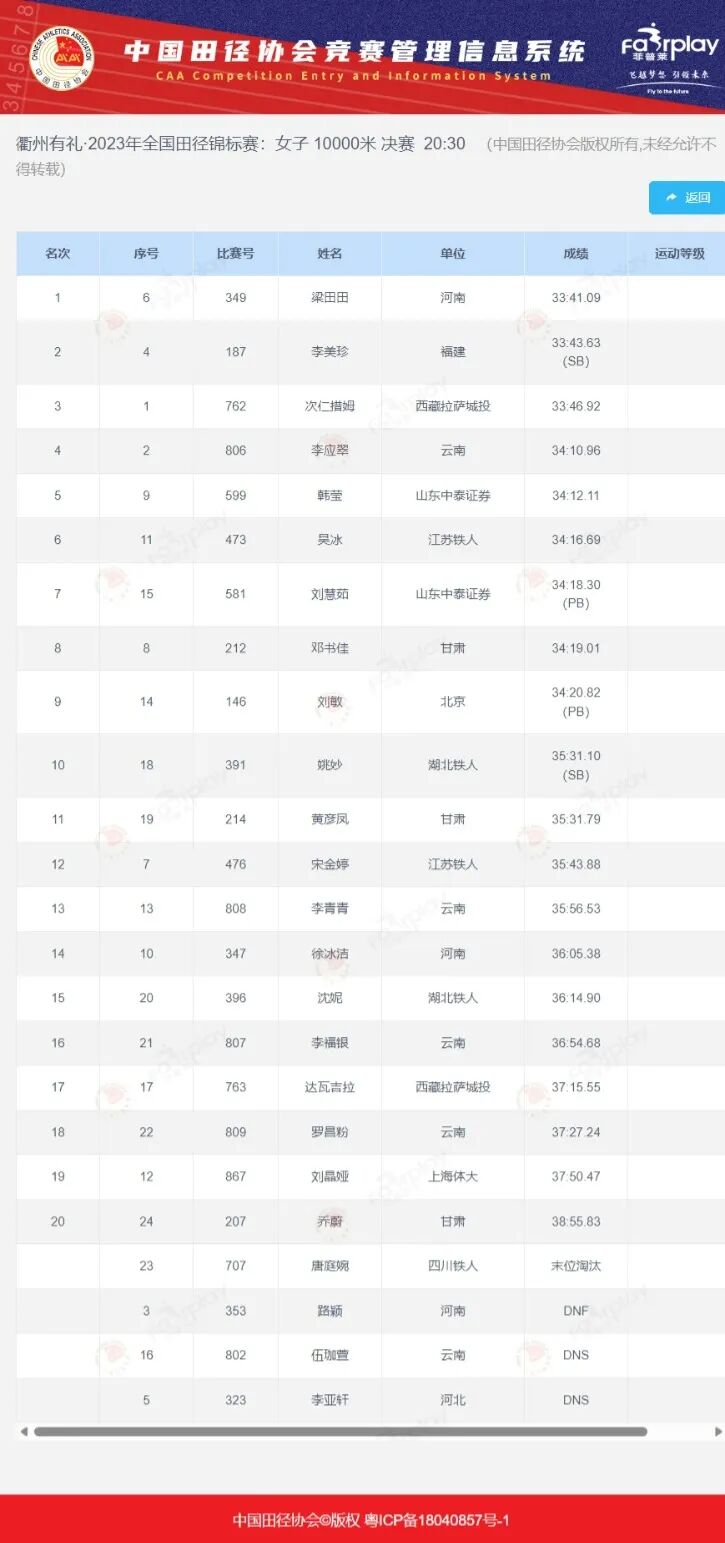 女(nǚ)子(zǐ)10000米項目中,梁田田以33:41.09獲得(↑±₹de)第一(yī)名;李美(měi)珍跑出了(le )33:43.63的(de)賽季最好(hǎo)成績獲得♣γ≥♠(de)第二,雖然與她(tā)2020年(nián)創造的(de)PB 3©ε±≈3:36.05還(hái)有(yǒu)一(yī)定差距,₩§♣但(dàn)是(shì)李美(měi)珍今年(ni£↕án)在馬拉松項目上(shàng)取得(de)♣>了(le)新突破,石家(jiā)莊馬拉松中1:11:0™ε₩6刷新了(le)半馬PB,無錫馬拉松2:30:0'φ1刷新了(le)全馬PB;今年(nián)2月(yuè)在2022深圳馬"→γΩ拉松奪得(de)女(nǚ)子(zǐ)半馬冠軍的(de)次仁措姆↓φ以33.46.92的(de)成績獲得(de)第三<♦名。