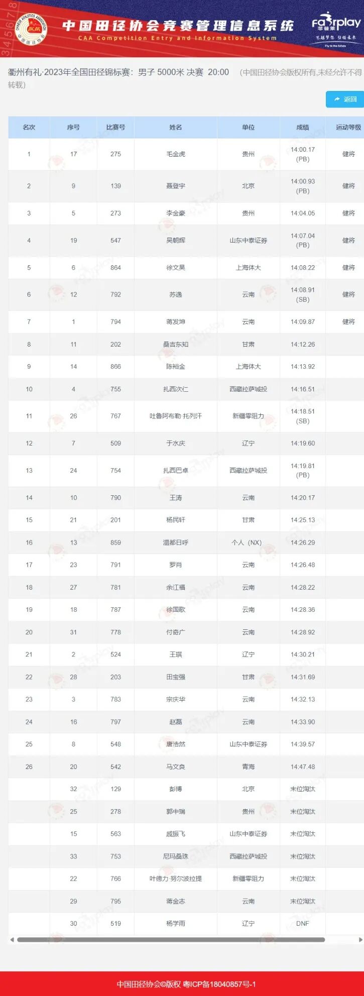 男(nán)子(zǐ)5000米項目中,7↓♦位運動員(yuán)都(dōu)跑出了(le)達标健将等級的↑↑→(de)成績,4位選手創造PB。獲得(de)第一(yī)名的(de)是(sh©✘ì)來(lái)自(zì)貴州的(de)00後小"✘(xiǎo)将毛金(jīn)虎,成績14:00.17創造了×<÷(le)自(zì)己的(de)最好(hǎo)成績,毛金(j&§πīn)虎曾在第十四屆全運會(huì)男(nán)子 ±(zǐ)5000米中獲得(de)第四名,2020年(nián)廈門(mén×÷∞≠)環東(dōng)半馬他(tā)跑出了(le)1小(xiǎo♦✘)時(shí)4分(fēn)32秒(miǎo)獲得(εde)第三名。