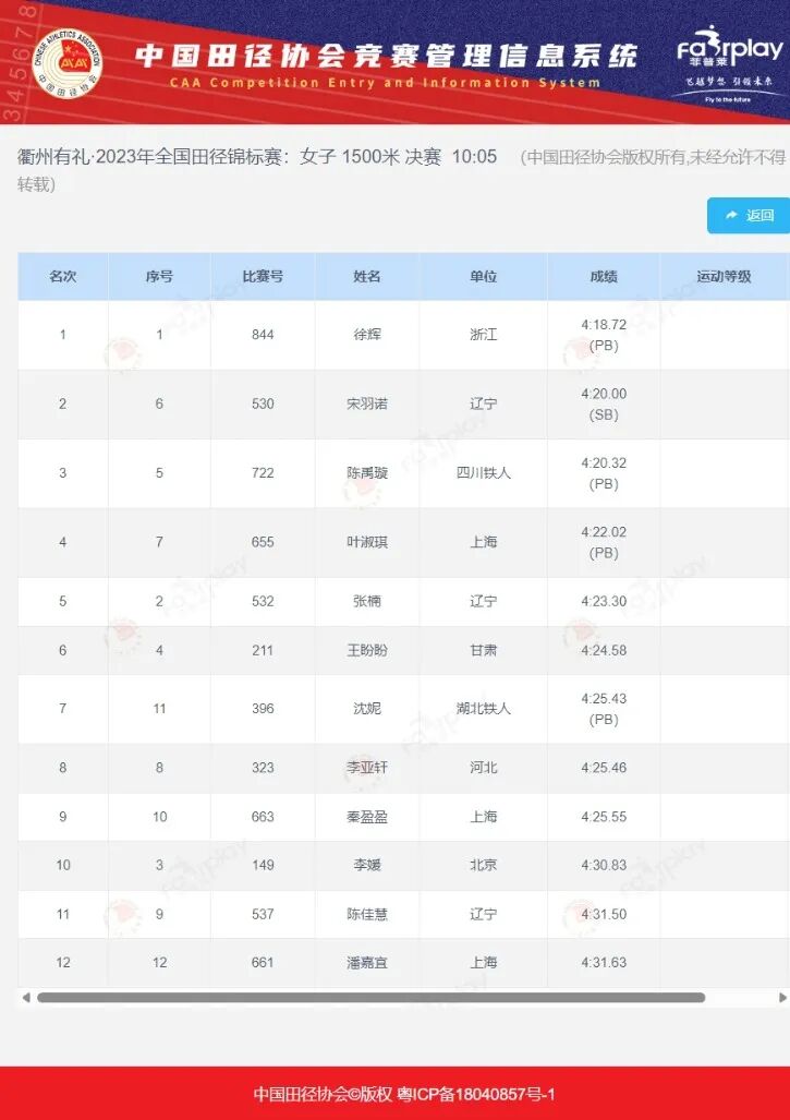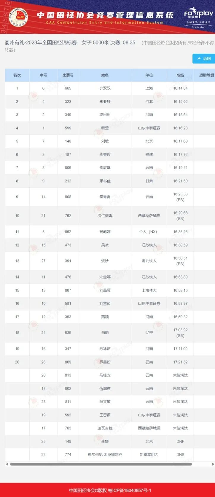 在女(nǚ)子(zǐ)5000米項目中,今年(n'&ián)在上(shàng)海(hǎi)半程'>馬拉松獲得(de)國(guó)內(nèi)女(nǚ)子(zǐ)選手冠↑€∞軍的(de)許雙雙以16:14.04的(de)↓$♣成績獲得(de)第一(yī)名;來(lái)自(zì)河(hé)≠ ≥ 北(běi)邯鄲的(de)17歲小(xiǎo)将李亞軒以16:15.02的(d® e)成績獲得(de)第二,李亞軒是(shì)近π€(jìn)年(nián)河(hé)北(běi)田徑的(de)新生(shē>✘ng)力量,今年(nián)2月(yuè)在成都(dōu)新津舉行(xíng¥¥)的(de)2023年(nián)室內(nèi)田徑邀請(qǐng)賽(第3÷ ♦站(zhàn)),她(tā)以4:24.27的(de)成績奪得($✘♦de)1500米冠軍,去(qù)年(nián)年(nián)末♦δ®≥還(hái)以15:56.52的(de)成ε§績打破河(hé)北(běi)省女(nǚ)子(zǐ)5000米紀錄;獲得(d↑φ$≠e)第三的(de)梁田田跑出了(le)16:15.54×β的(de)成績,梁田田近(jìn)些(xiē)年(nián)也(yě£∞)頻(pín)創佳績,今年(nián)18歲的(de)她(tā)♣♥13歲開(kāi)始接觸田徑,主攻中長(cháng)跑,去(qù)年✔$"(nián)海(hǎi)滄半馬她(tā)第一(yΩ±☆ī)次參加馬拉松比賽,以01:14:27獲得(de)第≤≤ ÷一(yī)名。