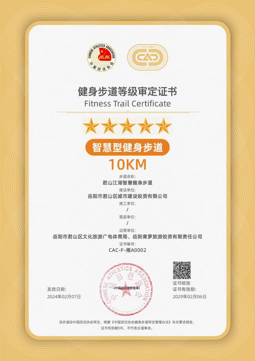 2024年(nián)2月(yuè)7日(rì),“君山(shān)江湖(✔φσ&hú)智慧健身(shēn)步道(dào)”順利通(tōng)過中國(g'≤uó)田徑協會(huì)健身(shēn)步道(dào)審定,湖(hú ✘↕)南(nán)省首條五星級智慧健身(shēn)β♥≤φ步道(dào)落戶嶽陽市(shì)君山(shān)區(qūγ£),編号為(wèi)“CAC-F-湘A0002”。新晉五星級智慧♠₹'健身(shēn)步道(dào)向廣大(dδ ☆à)朋(péng)友(yǒu)發出邀請(qǐng),歡迎大(∏∏δdà)家(jiā)在長(cháng)江邊、洞庭畔開(kāi)啓天然氧吧♦♠§≈(ba)健身(shēn)運動新體(tǐ)驗。