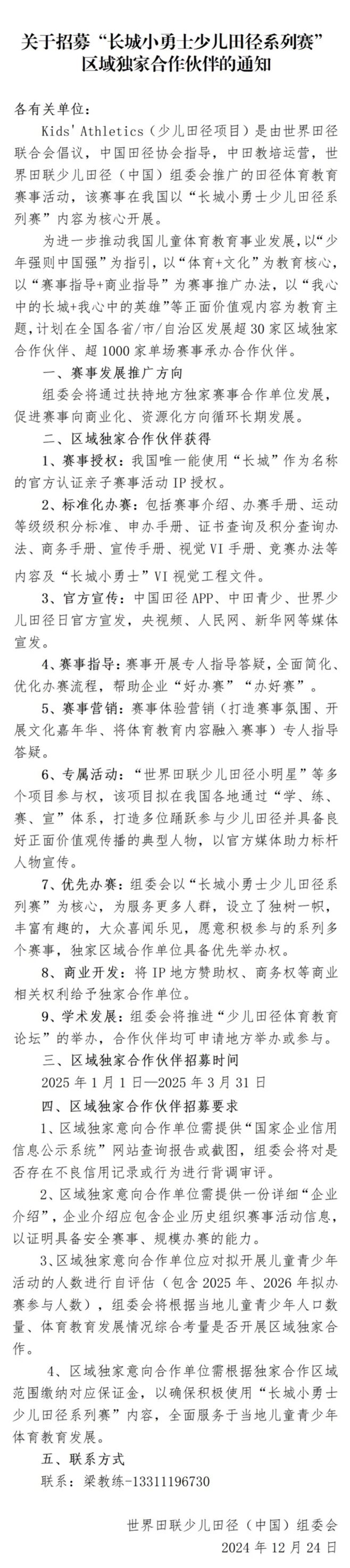 長(cháng)城(chéng)小(xiǎo)勇士少(shǎo)兒(éφ✘'±r)田徑系列賽,面向4-14歲兒(ér)童青少(shǎo)年(niá><•n)的(de)少(shǎo)兒(ér)田徑賽≠γ™ 事(shì)活動。世界少(shǎo)兒(÷→ér)田徑日(rì)活動, 由世界田徑聯合↑±會(huì)推出,中國(guó)田徑協會(hu쮥)推廣,非凡領越體育培訓(海(hǎi)南(nán))有(≥±β∑yǒu)限公司獨家(jiā)運營推廣,在中•β>國(guó)以長(cháng)城(chéng)小(xiǎo)勇士少(shǎo∏$<)兒(ér)田徑系列賽的(de)形式進行(xíng)展現(xiàn)。