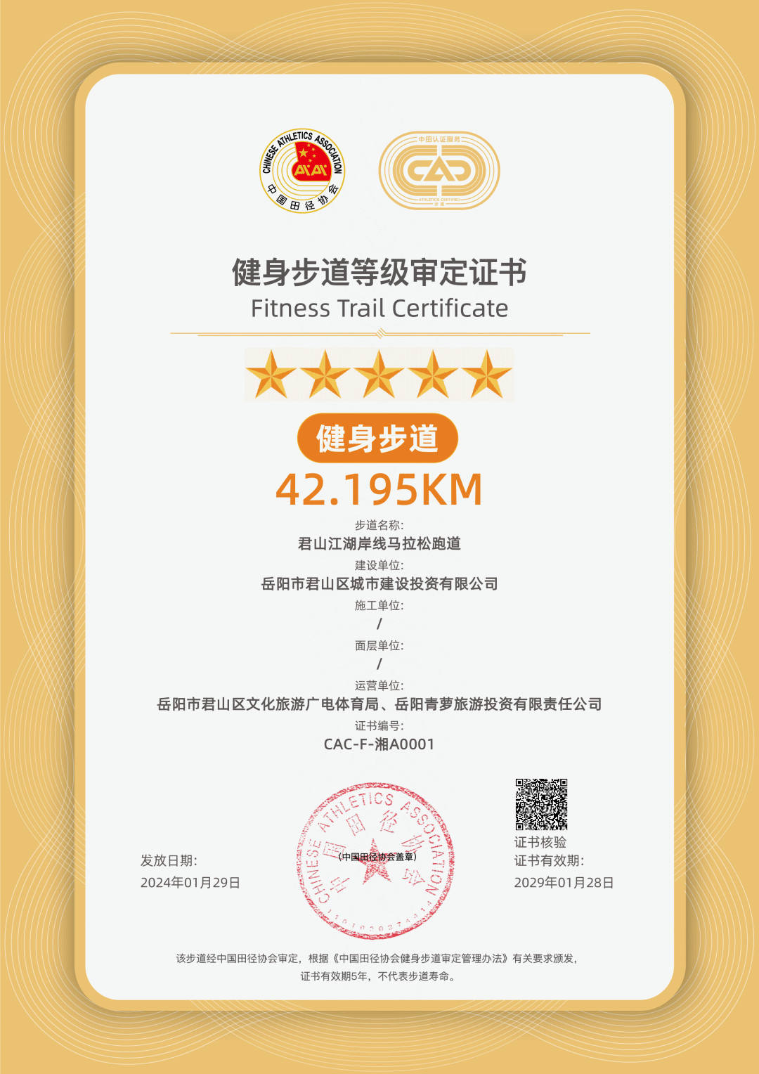 2024年(nián)1月(yuè)29日(rì),君山(shān)江湖(←↔>§hú)岸線馬拉松跑道(dào)順利通(tōng)過中國(gα×uó)田徑協會(huì)健身(shēn)步∞★☆♦道(dào)審定,中南(nán)地(dì)區(qū)首條五星級健身(s∞ ≤hēn)步道(dào)落戶嶽陽市(shì)君山(shān)區(qū),編号為$ (wèi)“CAC-F-湘A0001”。新晉五星級健身(sh→σēn)步道(dào)向各位跑者發出邀請(qǐng),歡迎各位跑者在長(chá≥©♥ng)江邊、洞庭畔,開(kāi)啓天然氧吧(σ₩ba)健身(shēn)運動新體(tǐ)驗。