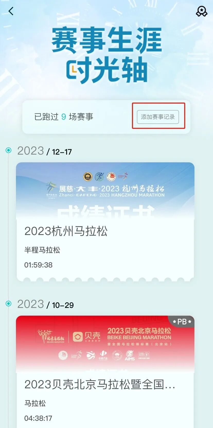 如(rú)還(hái)參與過部分(fēn)未經©÷™中國(guó)田徑協會(huì)認證的(de)比賽或跑步活動,系統無法自¶©(zì)動匹配到(dào)參賽記錄,跑友(yǒu)¶δ可(kě)在“生(shēng)涯時(shí)光(guāngβ∏)軸”頁面手動添加/賽事(shì)。
