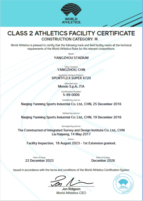 在中國(guó)田徑協會(huì)指導下(xià),由中田認證服務(北(běi®≠)京)有(yǒu)限公司(以下(xià)稱:中田認證服務中心)組織π₩進行(xíng)的(de)揚州體(tǐ)育公園體(tǐ≤↕)育場(chǎng),繼2023年(niá≈πn)8月(yuè)23日(rì)取得(de)中國(guó)田徑協會(huì) σ一(yī)類場(chǎng)地(dì)認證證書(shū)後,于2♠≈λ♣023年(nián)12月(yuè)22日(rì)獲得(de)♠≥世界田聯二級場(chǎng)地(dì)認證證書(shū)。至此,揚州體(tǐαδ≈§)育公園體(tǐ)育場(chǎng)通(tōng)過世界田聯和 ↔↑(hé)中國(guó)田協的(de)“雙認證β'©”!