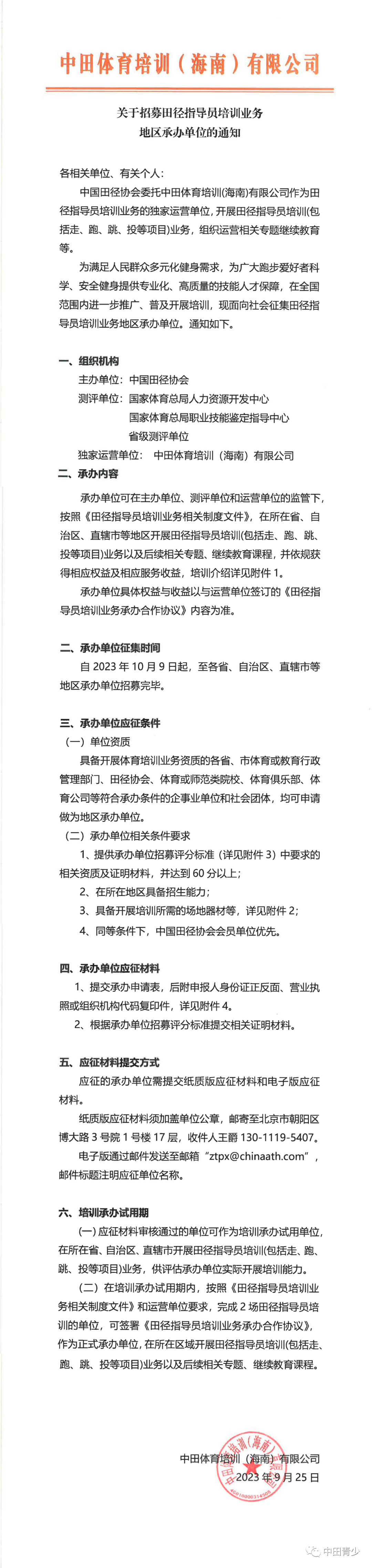 關于招募田徑指導員(yuán)培訓業(y ±'™è)務地(dì)區(qū)承辦單位的(de)通(tōng)知(zλ ÷hī)