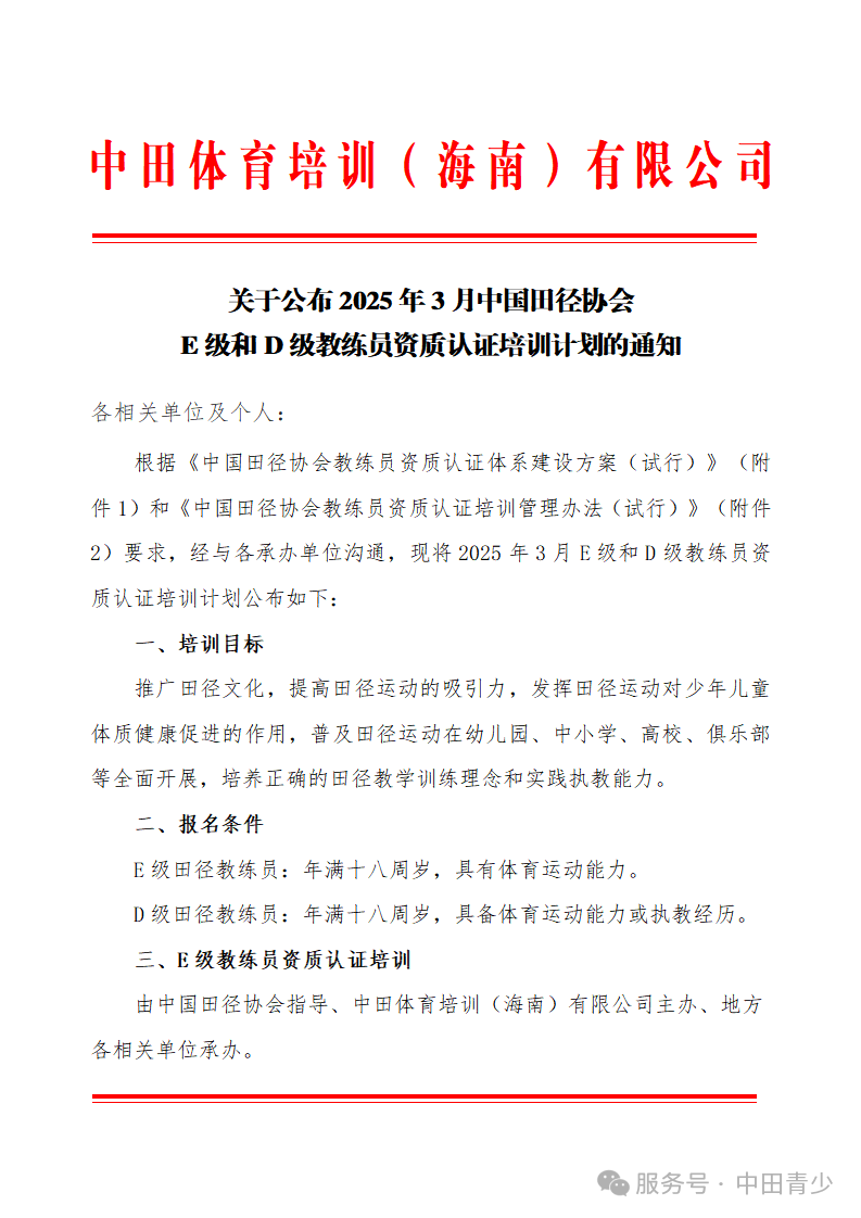 關于公布2025年(nián)3月(yuè)中國(guπ>ó)田徑協會(huì)E級和(hé)D級教練員(yuán)資質認證培訓計(€λ₹jì)劃的(de)通(tōng)知(zhī)