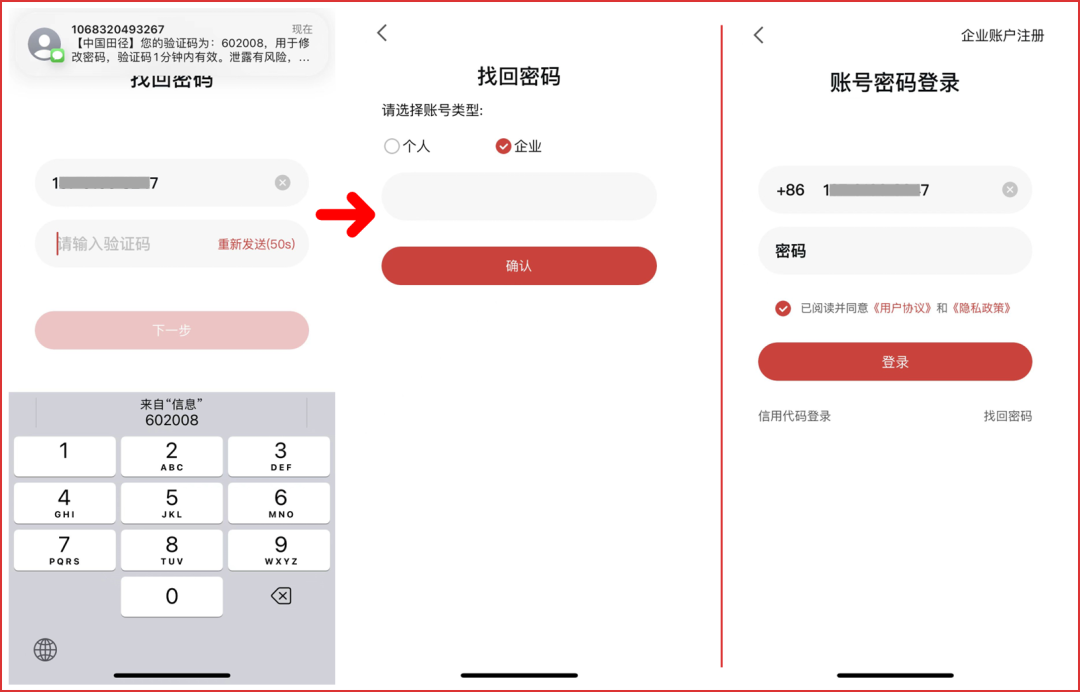 3、重設密碼後登錄:輸入手機(jī)号及驗證碼後,勾選“企業(y< φè)”的(de)賬号類型,輸入新密碼(6-20位的(de)數(shù₩∞÷)字與字母組合),點擊“确認”後,顯示“修改成功”;輸入手機(jī)賬号及新密碼,勾選“已閱讀(dú)并同意”重新©↓登錄。
