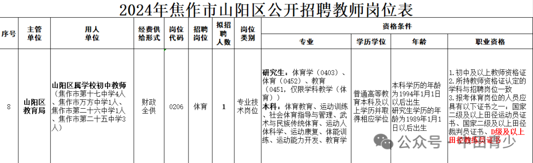 2024年(nián)6月(yuè)焦作(γ®★zuò)市(shì)山(shān)陽區(qū) ↑公開(kāi)招聘教師(shī),體(tǐ)育崗位明(míng)↕∞>确要(yào)求,除教師(shī)資格證λ報(bào)考體(tǐ)育崗位的(de)人(rén)員(yuán☆Ω)應具有(yǒu)以下(xià)證書(shū)之一(yī):國(gu₽₩ó)家(jiā)二級及以上(shàng)田徑運動員(yuán¥×)證書(shū)、國(guó)家(jiā)二級及以上(shàng)田徑裁♣↑∑判員(yuán)證書(shū)、D級及以上(shàng)田徑教練員(yuán)證β 書(shū)