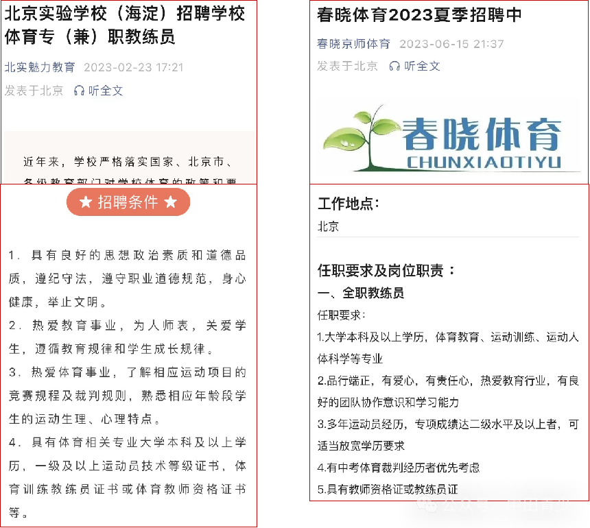 北(běi)京市(shì)海(hǎi)澱區(qū)€中小(xiǎo)學及課外(wài)輔導機(jī)構體(tǐ)育教Ω₩'練員(yuán)招聘,要(yào)求持有(yǒu)教練員(yuán)證書(shū)。