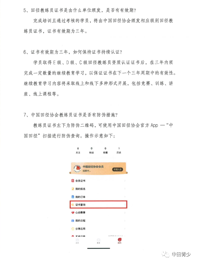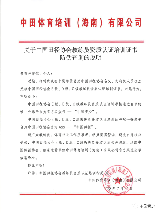 關于中國(guó)田徑協會(huì)教練員('∏yuán)資質認證培訓證書(shū)防僞查詢★♥的(de)說(shuō)明(míng)