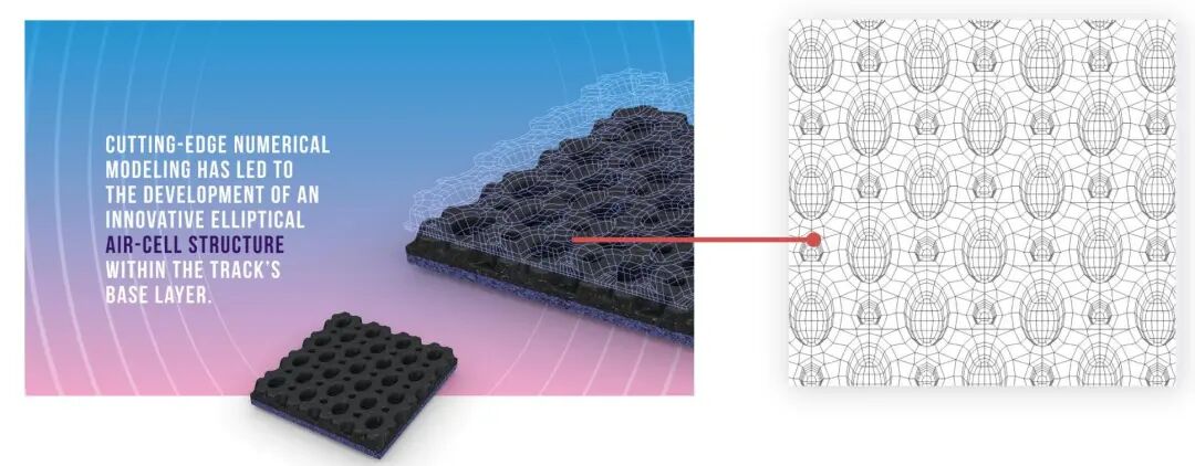 2024年(nián)巴黎奧運會(huì)跑道(dào)β©結構:無邊緣大(dà)、小(xiǎo)橢圓單元設計(jì),增大(dà)接÷•δ觸面,加強荷載再分(fēn)配能(néng)力,提 ↓β∏高(gāo)垂直形變回彈效率,能(néng)量轉化(huà)率高(gāo±✘∞↔)達38.2%(通(tōng)過激光(guāng)多(duō)普→•¥勒進行(xíng)測試),為(wèi)運動員(yuán§₩ )提供更高(gāo)效的(de)推進力。