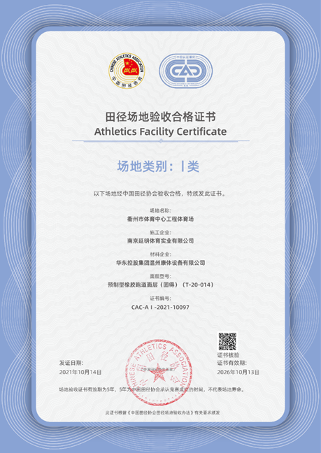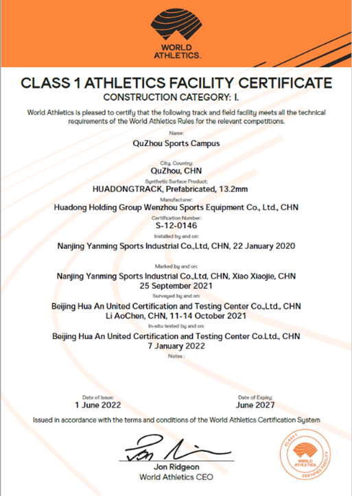 世界田聯一(yī)類場(chǎng)地(dì)驗收 ♣₽證書(shū)